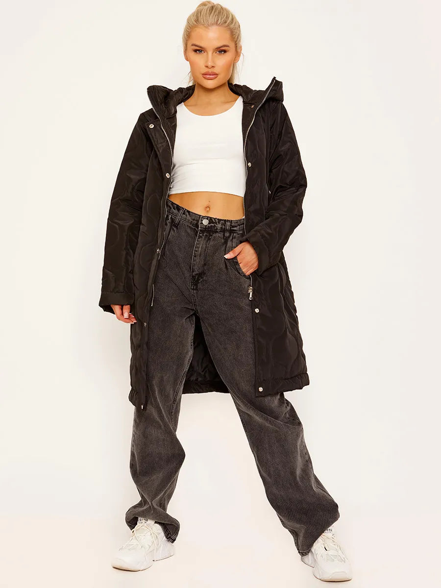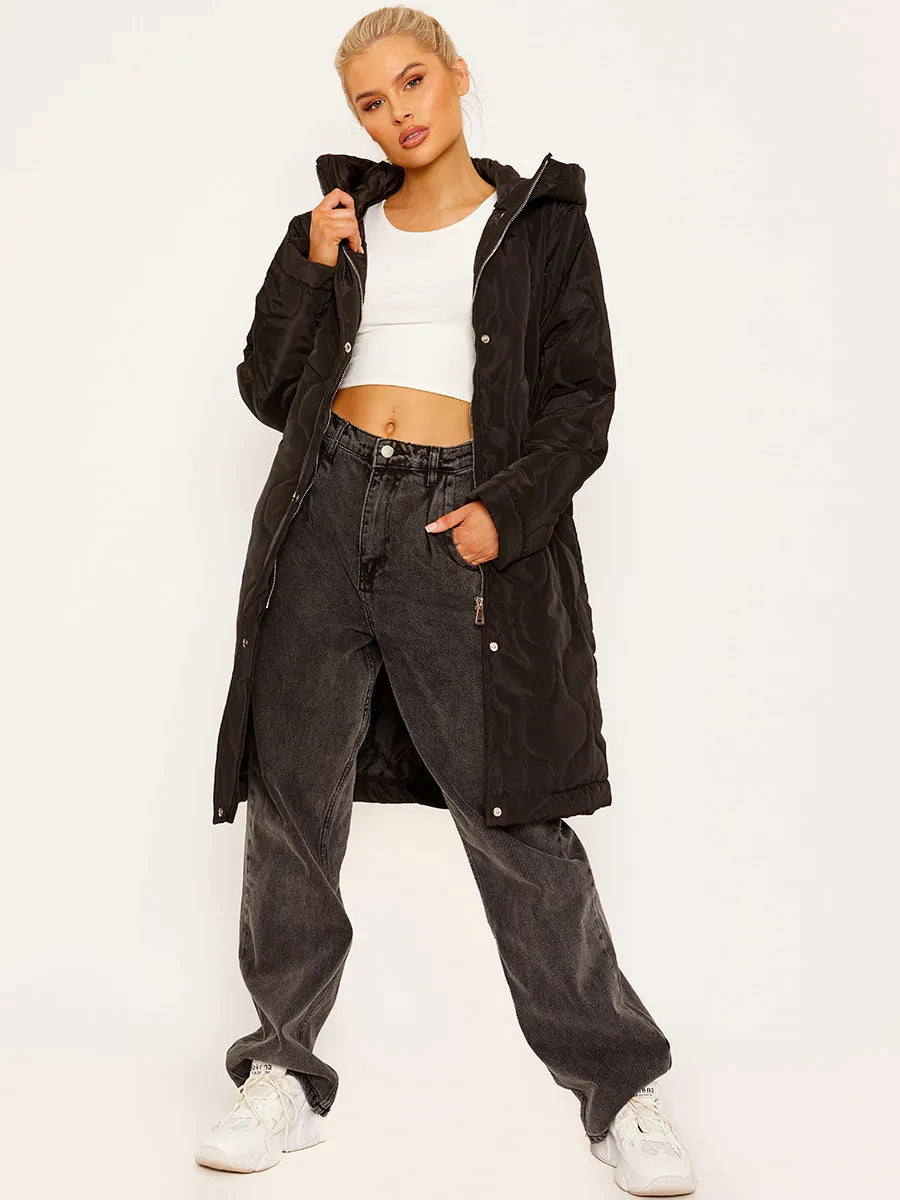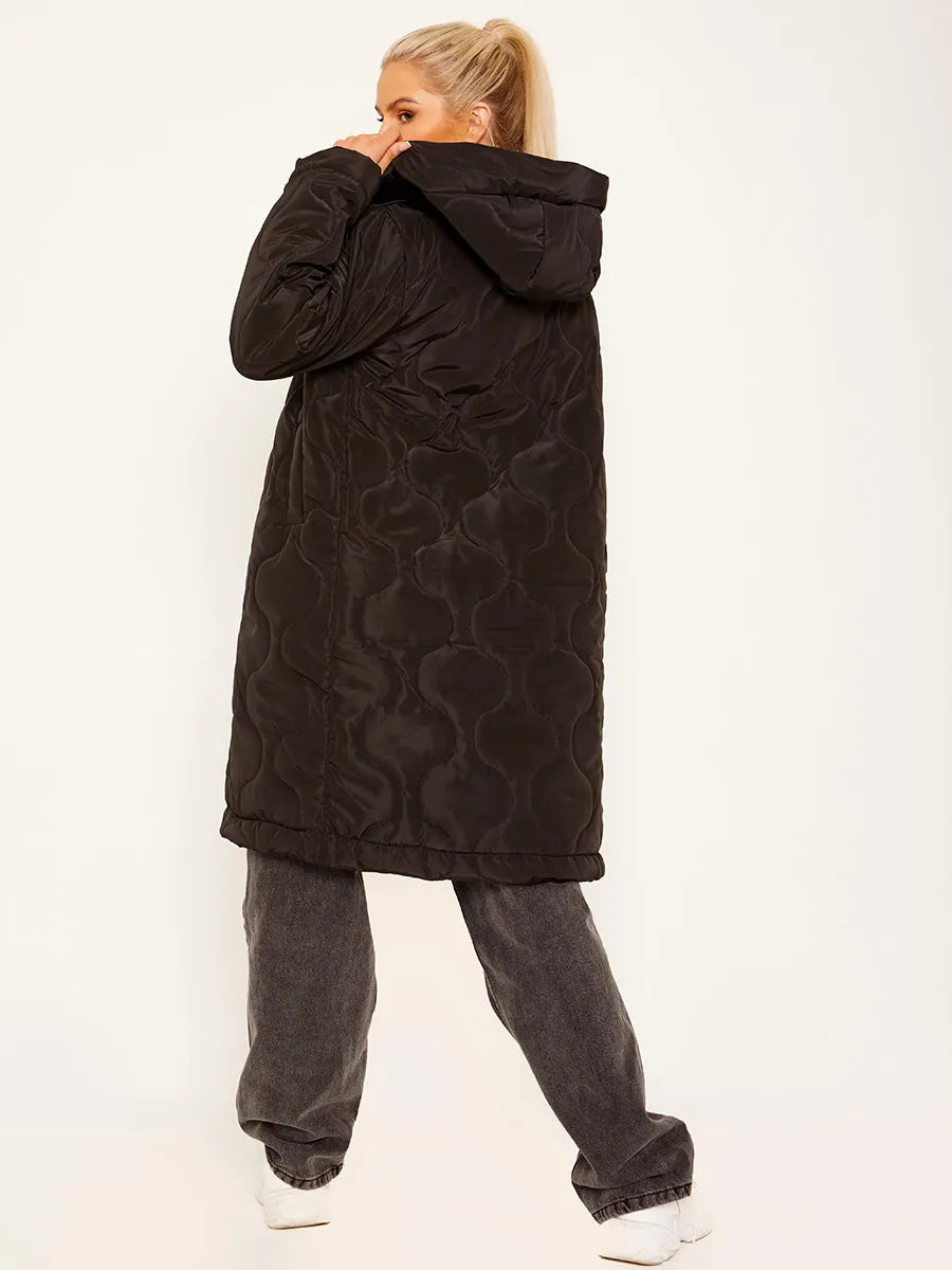 Black Onion Quilted Long Sleeves Longline Hooded Coat